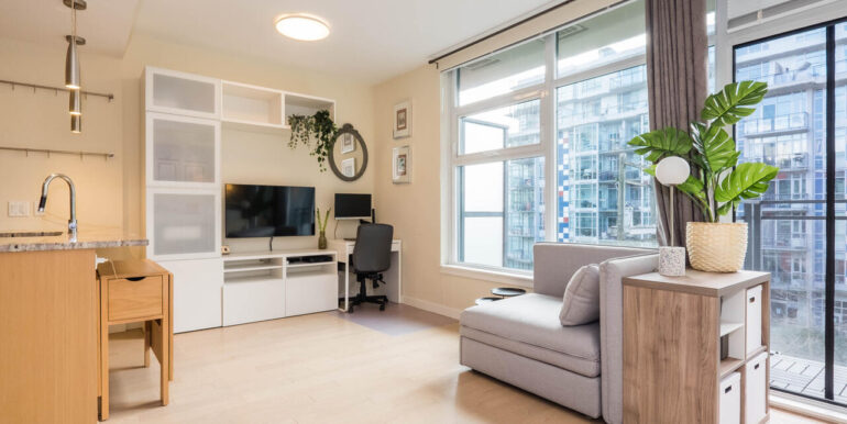 THE ONE- in False Creek – Spacious 1 Bed + Den + Flex south facing CORNER unit with abundant natural lighting! Features engineered hardwood floors, granite & quartz counters, quality Bosch/Fisher&Paykel appliances, central air conditioning with plenty of personalized storage space for your use. Comes with 1 parking stall, 1 storage locker and 1 bike locker. Great building amenities: outdoor rooftop pool, hot tub, yoga room, gym, party room and more! Garden plot at ground level available for gardening lovers. Steps to Seawall, Skytrain, restaurants, in the heart of Olympic Village. Showing by appointment on Saturdays 2-4pm. Book your private showing today.